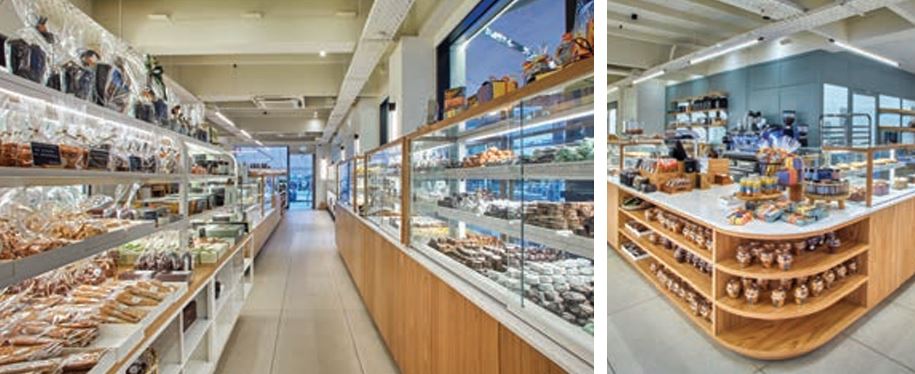 Διαθέτει δύο εισόδους· η πρώτη οδηγεί τους πελάτες στο αρτοποιείο, ενώ η δεύτερη στο ζαχαροπλαστείο. Ιδιαίτερο αισθητικό ενδιαφέρον παρουσιάζουν οι ουδέτερες βιτρίνες της τζαμαρίας, κατασκευασμένες από μέταλλο και κρύσταλλο, ενώ οι ψυχόμενες βιτρίνες ξεχωρίζουν χάρη στην κορνίζα από φυσικό δρυς που πλαισιώνει τα κρύσταλλα.
