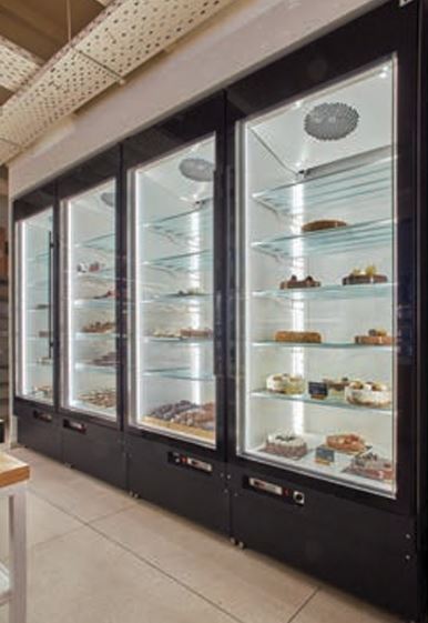 Στο βάθος του καταστήματος, τέσσερα όρθια ψυγεία συντήρησης και κατάψυξης, κατασκευής ΕΥΡΩΨΥΚΤΙΚΗ DESIGN, σε μαύρη απόχρωση, δημιουργούν μια ενδιαφέρουσα αντίθεση με τις γήινες αποχρώσεις του χώρου.